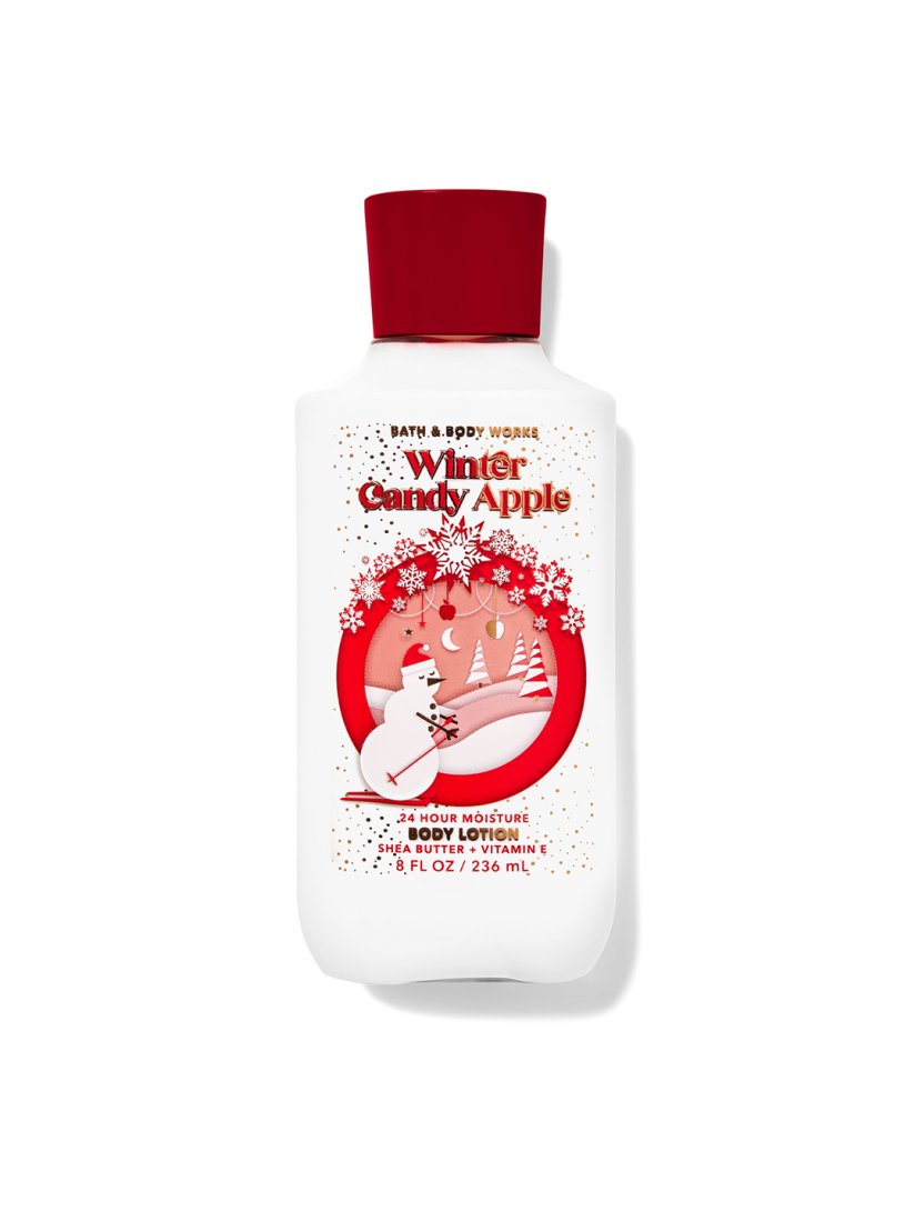 Bath and Body Works Winter Candy Apple Lotion  236 ml with Shea buter and vitamin E is your  daily nourishing body lotion  partner with a scent you love!  Its Nourishing, hydrating and scented quality will keep you hydrated all day experiencing a super sweet fruit treat! Fragrance notes are  red apples, winter rose petals, crisp pears candied oranges, maple leaf and fresh cinnamon.
