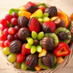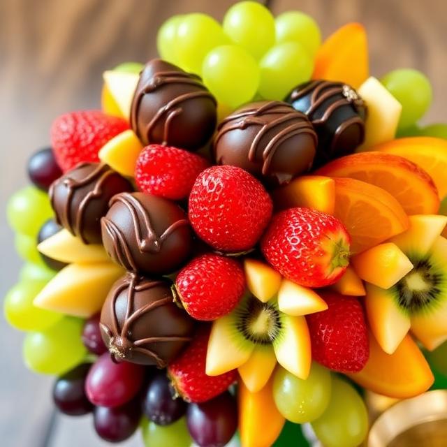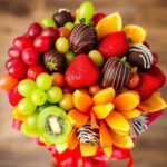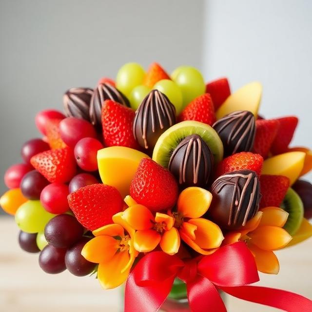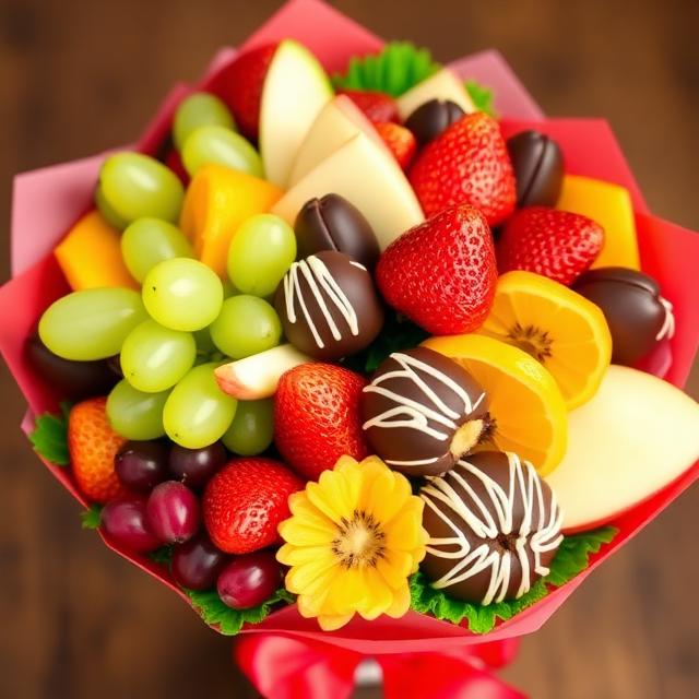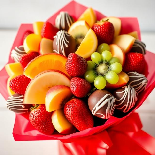 Gift this unique seasonal colourful fruit arrangement of red grapes, green grapes, chocolate coated strawberries, red strawberries, wedged apples, wedged oranges and sliced kiwi fruit with chocolate coated strawberries with icing arranged in a shape of a flower bouquet gift wrapped with ribbon of your choice. Available in the shape of bouquet or in a gift basket.
