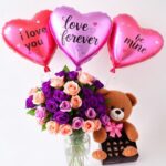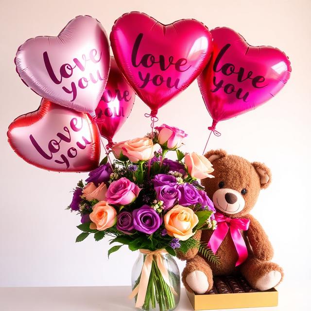 It will truly be a grand entrance with this grand bouquet of mixed colour roses, her favourite teddy bear with heart to top it with not one but 4 inflated i love you balloons and a 16 pieces box of chocolates all stylishly assembed together to delight the special person in your life! You have an option to purchase the Grand Entrance Masterpiece with or without a vase too, so what are you waiting for, order this show stopper this Valentines or for that special occassion!!
